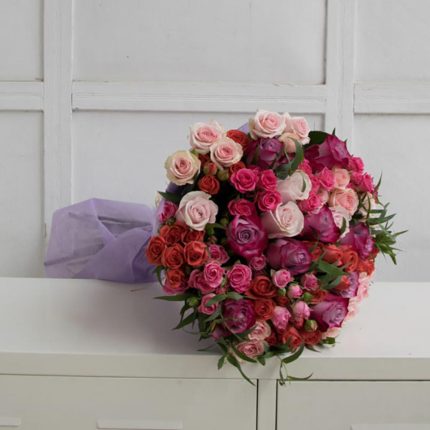 Смешанный букет из роз и гипсофилы и других цветов. Приблизительный размер 55×60.