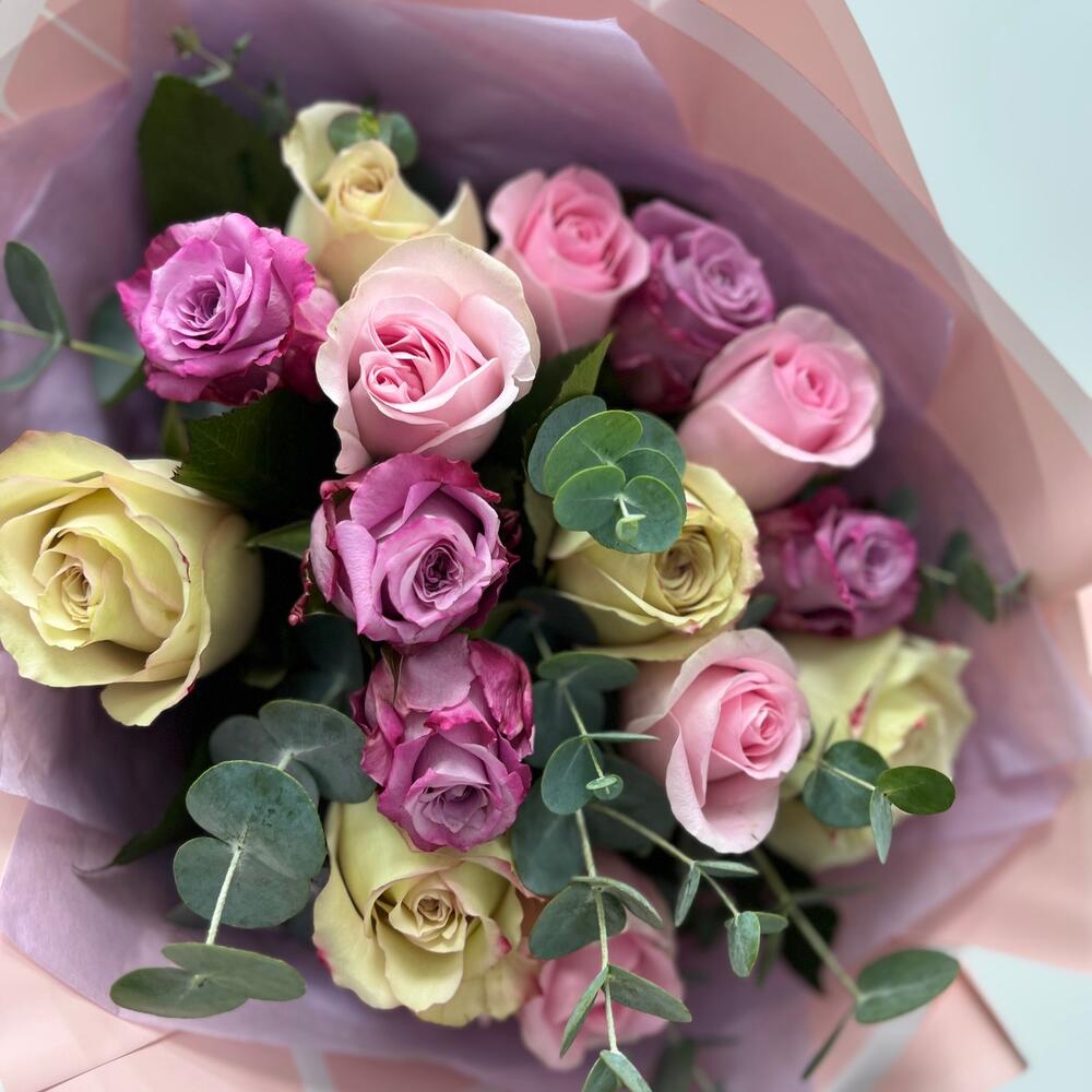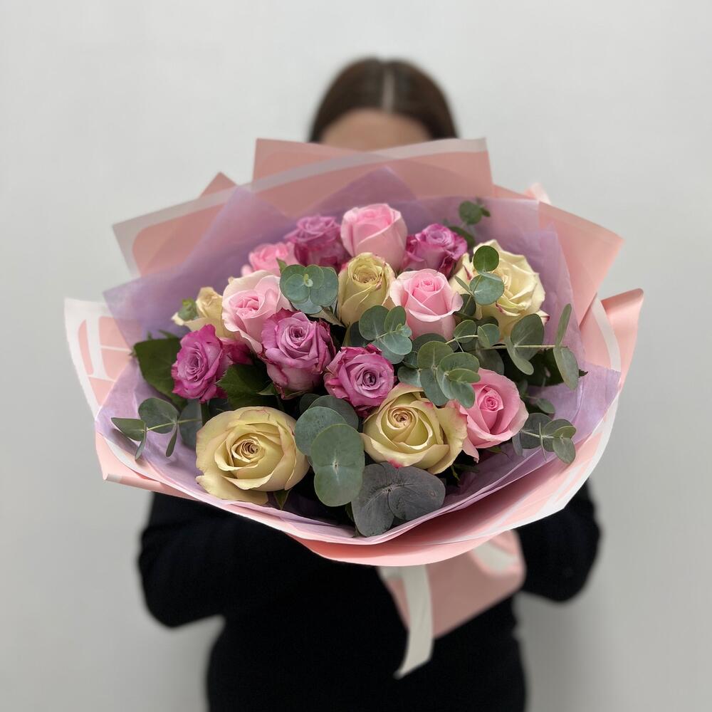 Упаковка дизайнерская – 1 шт.эвкалипт ветка – 1 шт.микс роз – 15 шт.