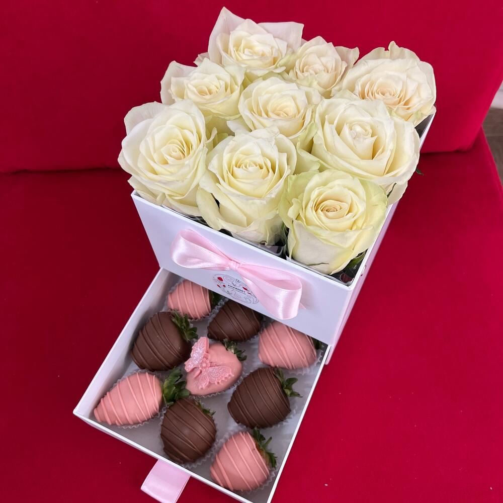 Роза – 9 шт.Клубника в шоколаде callebaut (бельгия) – 9 шт.Коробка шляпная – 1 шт.