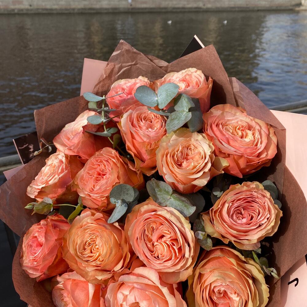 Mono bouquet 34 из 15 пионовидных роз с эвкалиптом