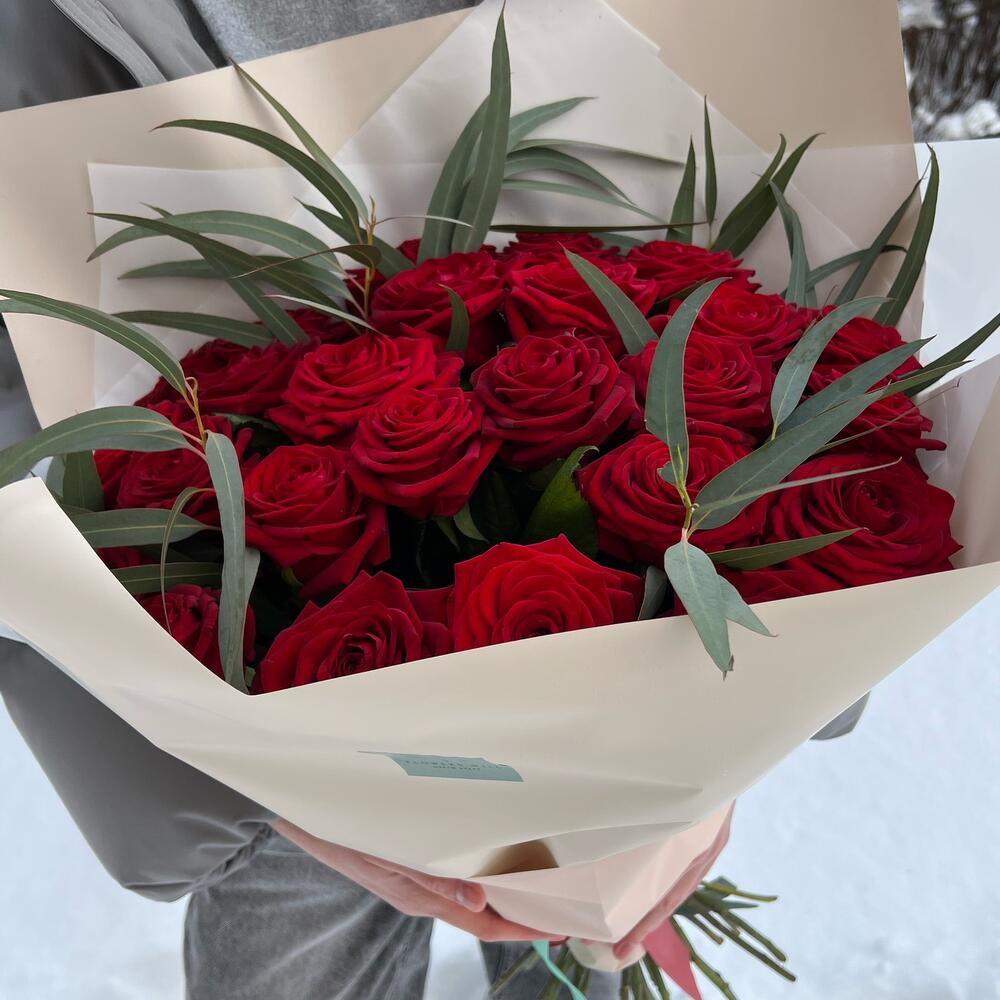 Красная роза 50 см – 25 шт.Эвкалипт – 5 шт.Дизайнерская упаковка – 1 шт.Лента атласная – 1 шт.
