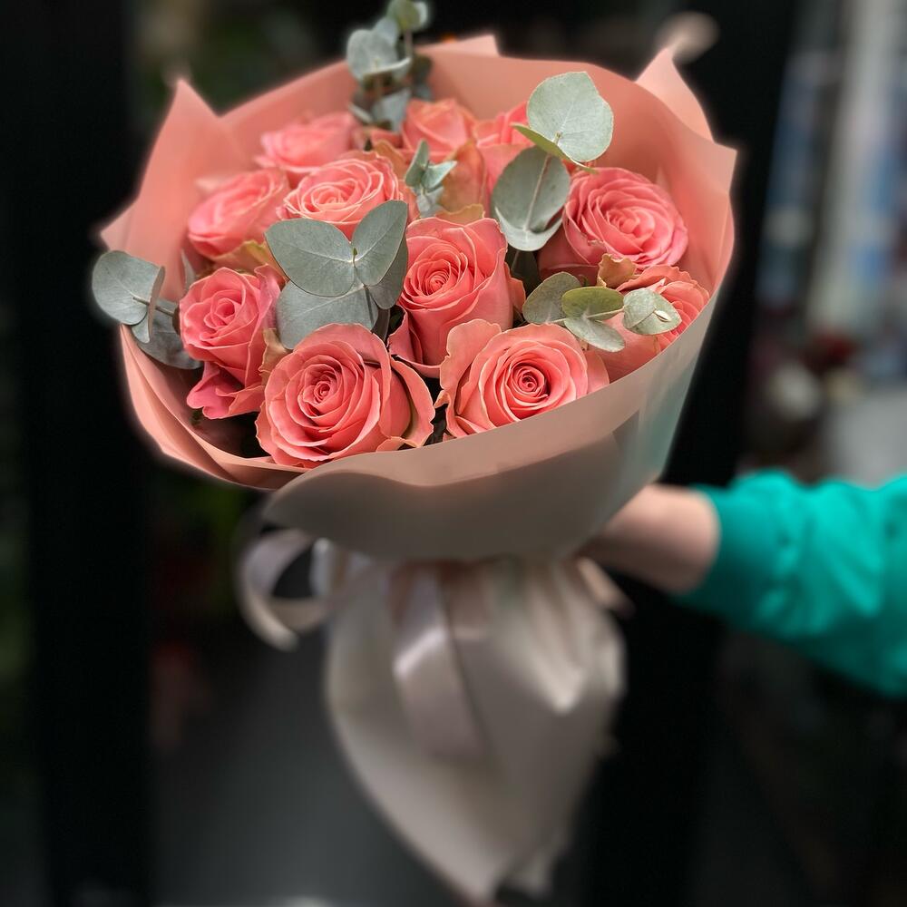 Роза – 11 шт. Эвкалипт – 5 шт. Упаковка дизайнерская – 1 шт.