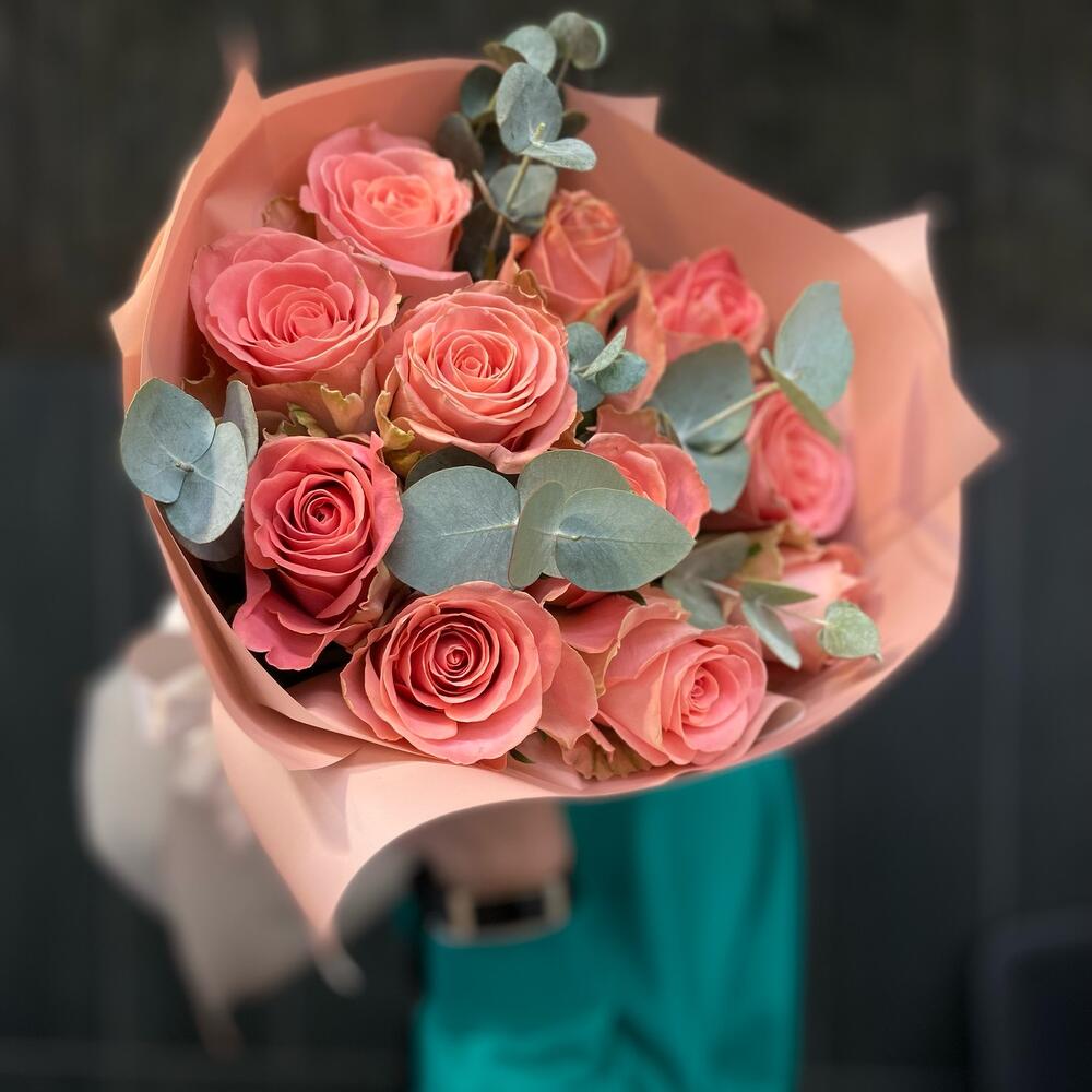 Монобукет из роз с эвкалиптом