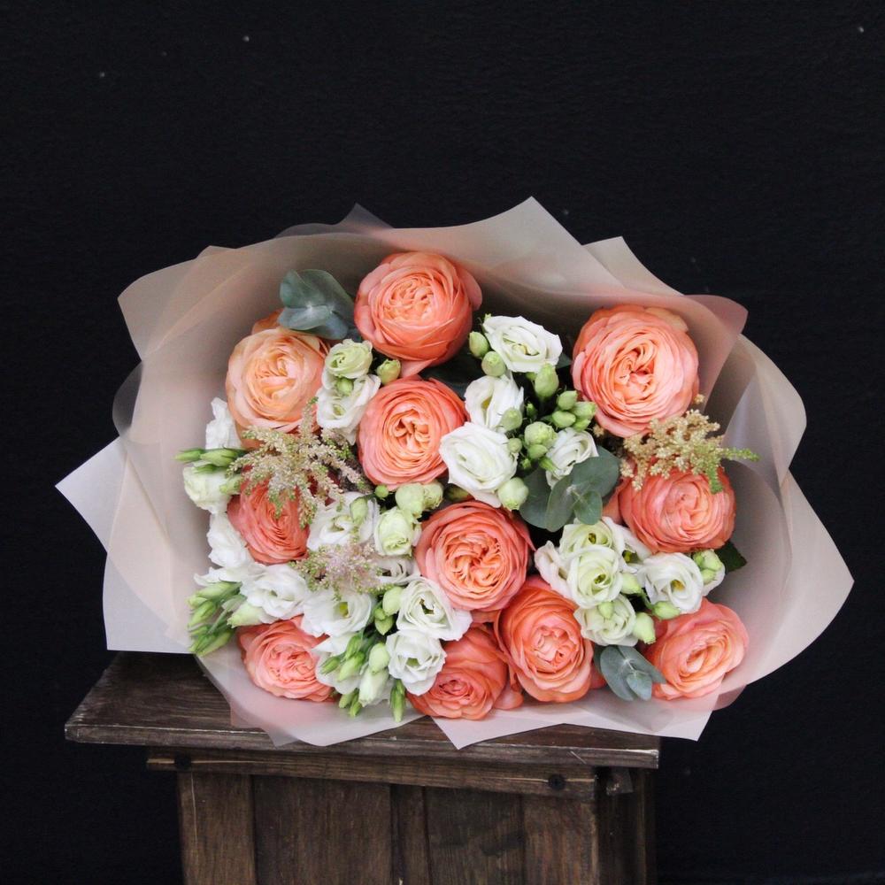 Роза пионовидная кахала – 11 шт.Эустома – 5 шт.Астильба – 3 шт.Эвкалипт – 3 шт.Пленка дизайнерская – 5 шт.Лента атласная – 2 шт.