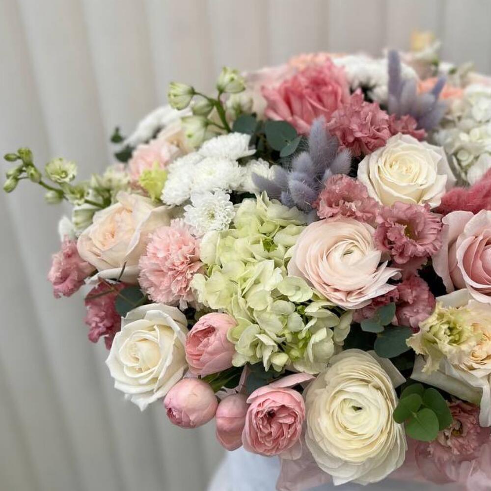 Фисташка – 1 шт.Эвкалипт – 1 шт.Гортензия – 2 шт.Дельфиниум – 3 шт.Эустома – 3 шт.Гвоздика – 7 шт.white o’hara – 6 шт.Ранункулюс – 5 шт.Сухоцветы – 3 шт.пинк клауд – 8 шт.Сантини – 9 шт.pink o’hara роза – 3 шт.плайя бланка – 3 шт.менсфилд парк – 4 шт.