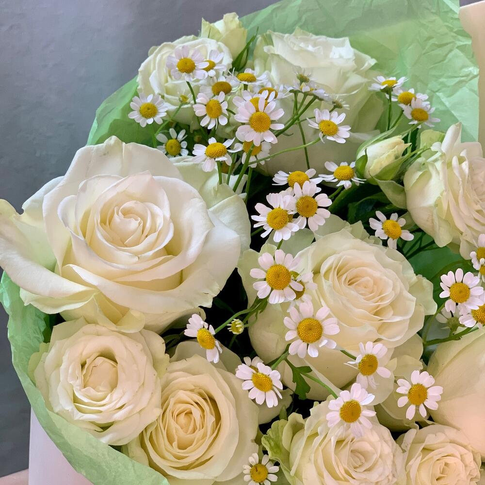 Нежный букет кулек с розами и ромашкой