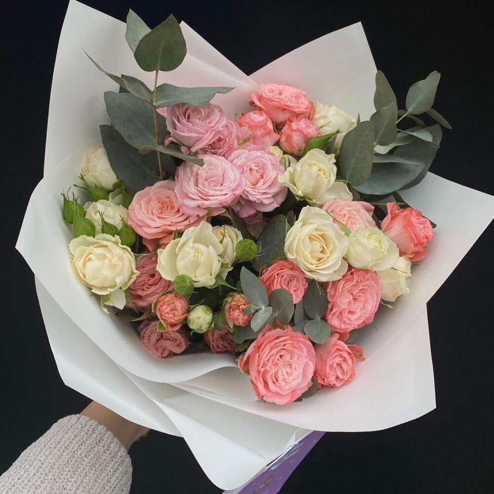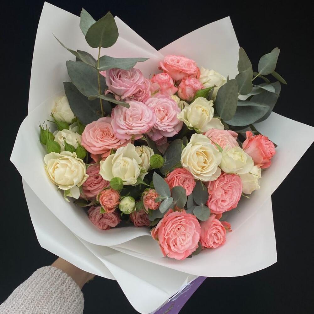 Авторский букет из розовых Пионовидных Роз и Эвкалипта