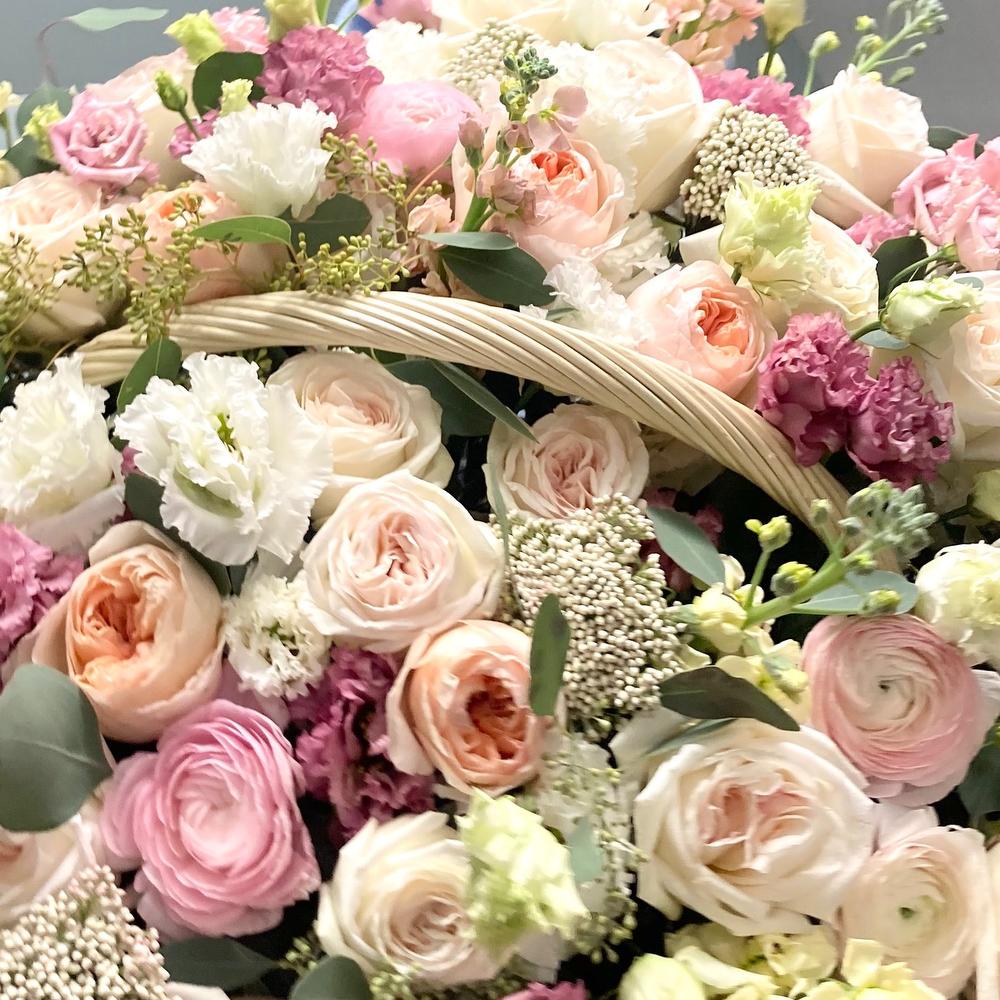 роза пионовидная juliet – 25 шт.Ранункулюс – 25 шт.роза пионовидная o’hara – 25 шт.Озотамнус – 15 шт.Маттиола – 25 шт.Лизиантус – 25 шт.Эвкалипт – 25 шт.Фисташка – 7 шт.Оазис флористический – 6 шт.Корзина – 1 шт.Пион белый – 9 шт.