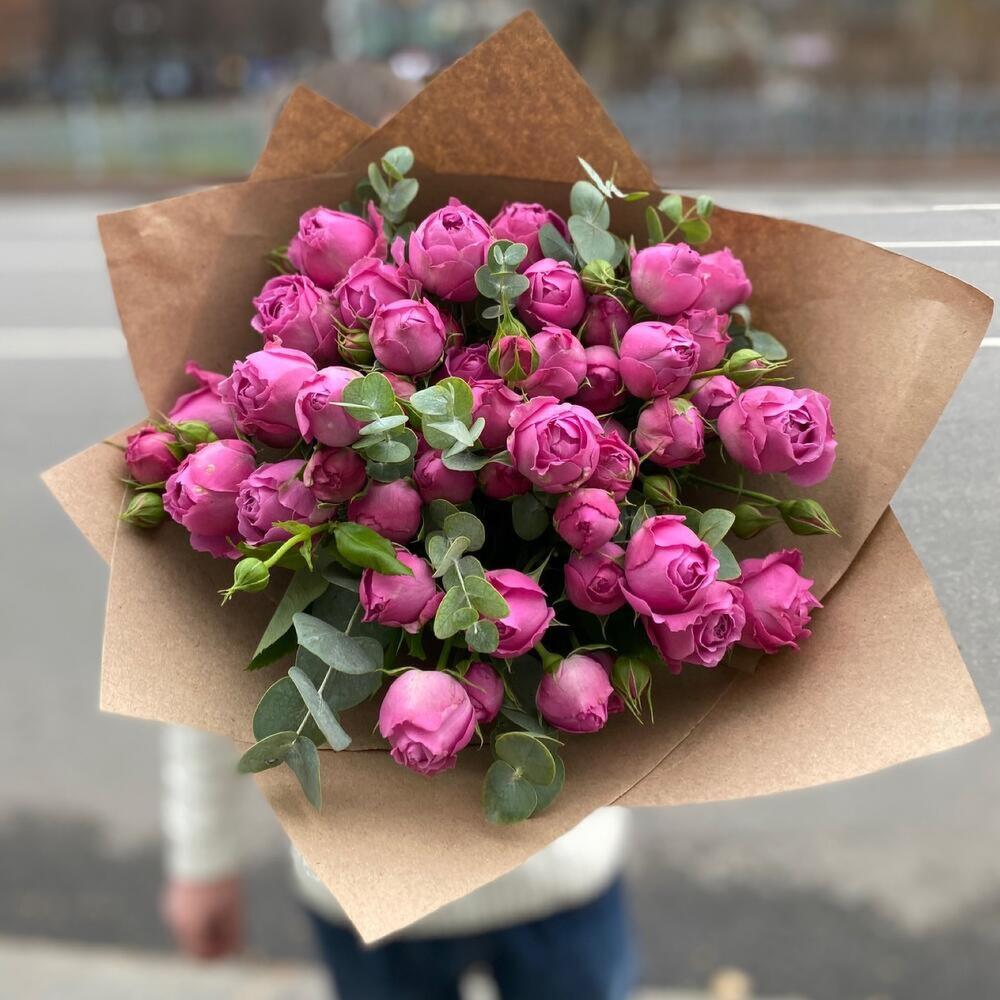 пионовидные розы Misty Bubbles – 11 шт. Эвкалипт – 3 шт. Крафт – 2 шт. Открыточка с вашими пожеланиями – 1 шт.