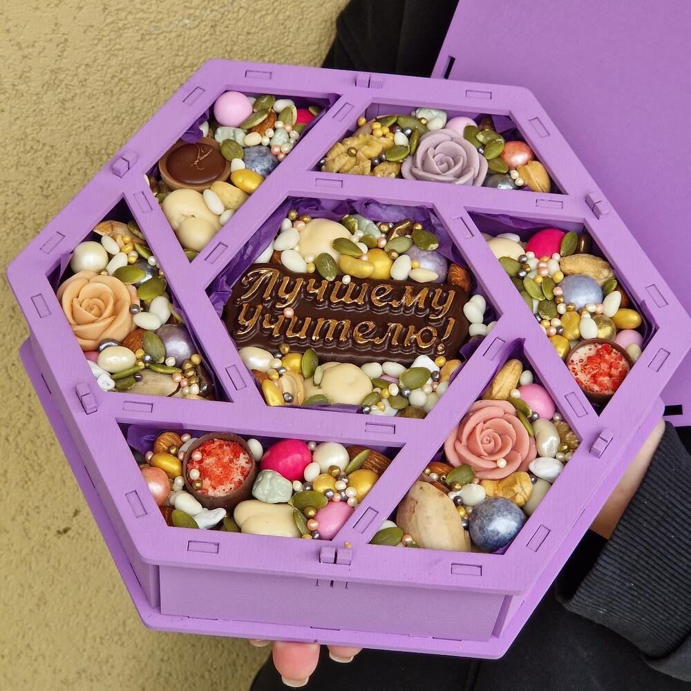 арахис в кунжуте и меде – 150 гр.арахис в сахарной глазури – 150 гр.арахис в белом шоколаде – 150 гр.Фундук – 50 гр.пекан в скорлупе – 3 шт.Грецкий орех – 50 гр.роза шоколадные – 3 шт.конфеты комильфо – 2 шт.конфета тоффи – 1 шт.Шоколадная надпись – 50 гр.грецкий орех в шоколаде – 40 гр.смородина в шоколаде – 25 гр.миндаль в клубничном шоколаде – 15 гр.арахис в цветной глазури – 16 гр.Миндаль – 20 гр.рисовые шарики в шоколаде xl – 15 гр.Кешью – 15 гр.шоколад в глазури – 15 гр.арахис в перламутре – 15 гр.семена подсолнечника в шоколаде – 15 гр.семена тыквы – 10 гр.рисовые шарики в шоколаде мини – 5 гр.