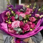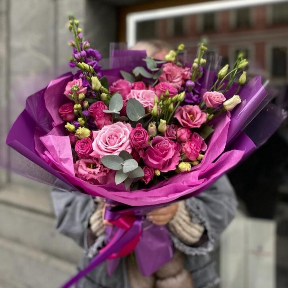 Маттиола – 3 шт.Роза одноголовая – 5 шт.эустома розовая – 2 шт.Кустовая малиновая роза – 3 шт.Эвкалипт – 2 шт.Дизайнерская упаковка – 1 шт.