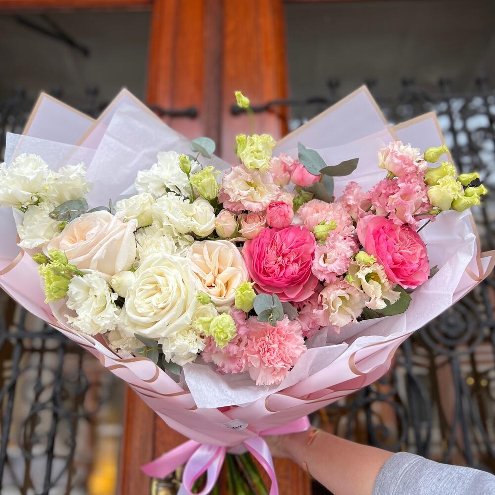 Эвкалипт – 2 шт.Кустовая пионовидная роза – 2 шт.Роза одноголовая белая – 3 шт.Диантус белый – 2 шт.Диантус розовый – 3 шт.Роза одноголовая розовая – 2 шт.Эустома белая махровая – 2 шт.Дизайнерская упаковка – 1 шт.эустома кружевная розовая – 2 шт.
