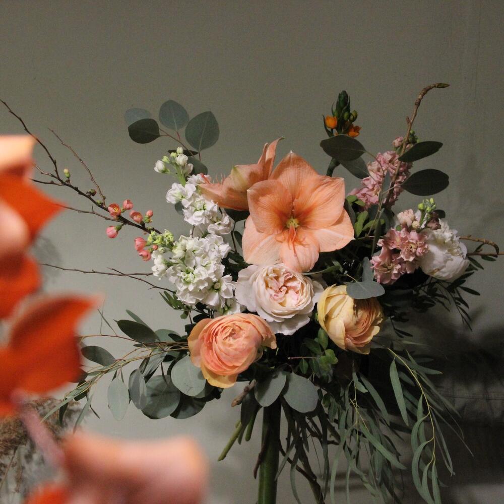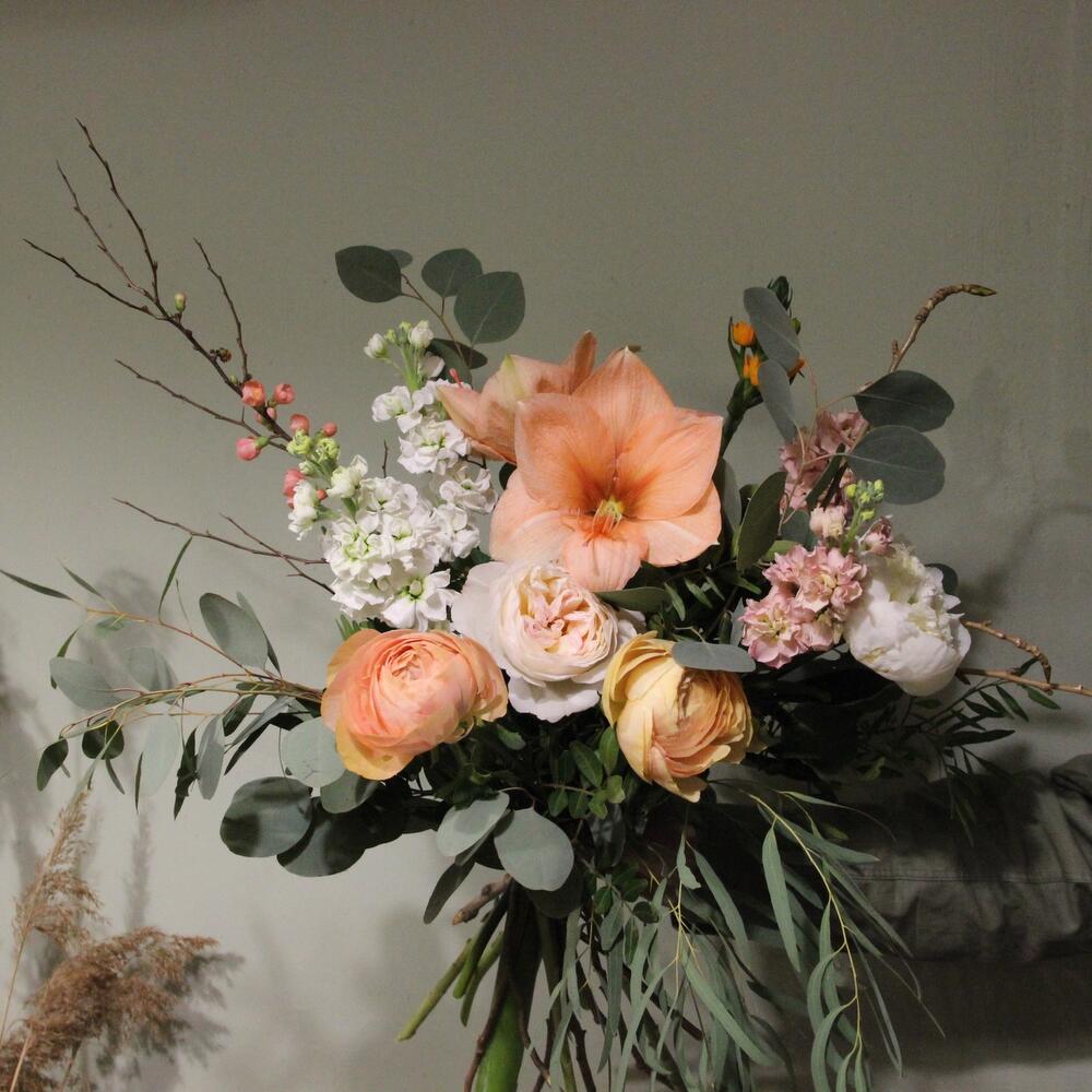 Букет с ранункулюсами, амариллисом, пионовидными розами, эвкалиптом и маттиолой.