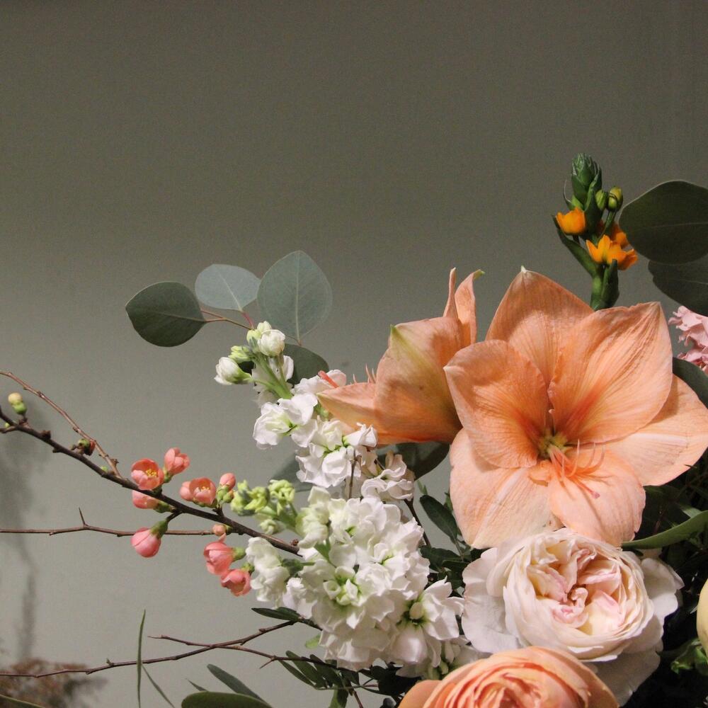 Амариллис – 1 шт.Орнитогалум – 1 шт.Маттиола – 6 шт.Пион – 1 шт.Ранункулюс – 2 шт.Роза пионовидная – 1 шт.Эвкалипт – 5 шт.ветки тополя – 1 шт.