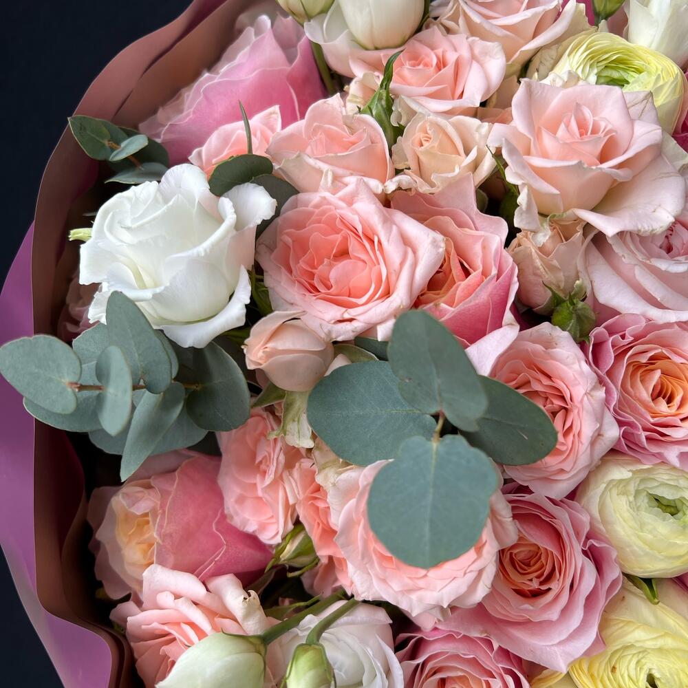 Лизиантус – 3 шт.Эвкалипт – 2 шт.Кустовая роза – 5 шт.Ранункулюс – 5 шт.Пионовидная роза – 4 шт.Атласная лента – 1 шт.Одноголовая роза – 13 шт.декоративная упаковка – 1 шт.