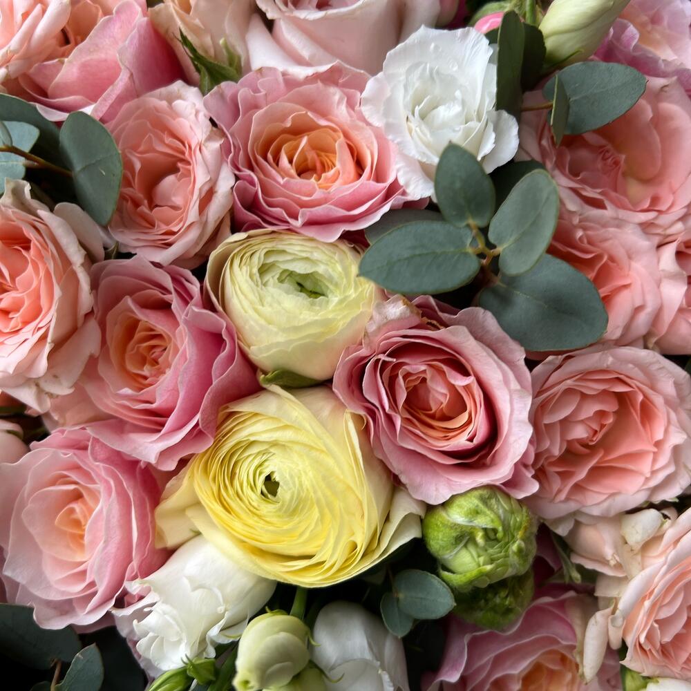 Роскошный букет с пионовидными розами и ранункулюсами «Аромат весны»