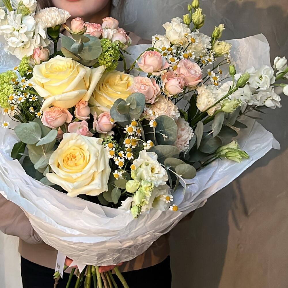 Роза пионовидная – 3 шт.Матрикария (Ромашка Камила) – 3 шт.Роза кустовая пионовидная – 3 шт.Маттиола – 3 шт.Эвкалипт – 1 шт.Вибурнум – 2 шт.Лизиантус – 2 шт.Упаковка дизайнерская – 1 шт.