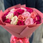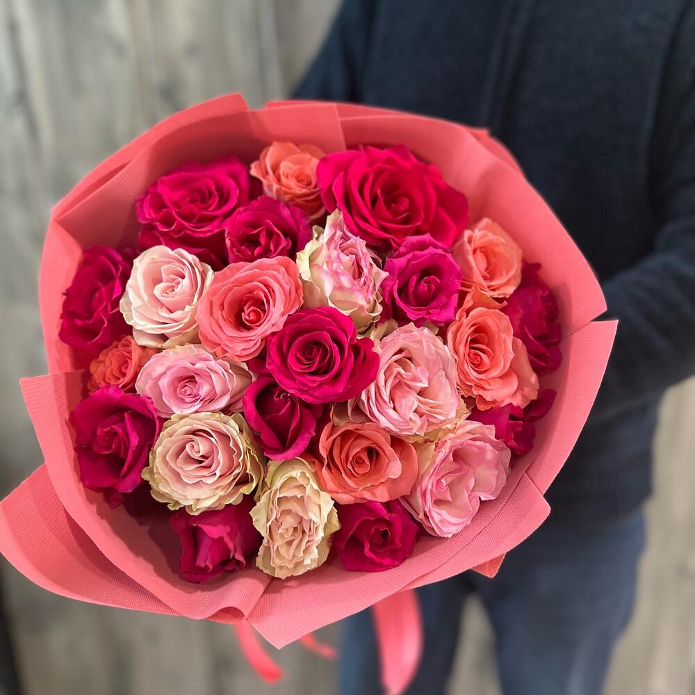Розовый микс из 21 розы в фирменной упаковке