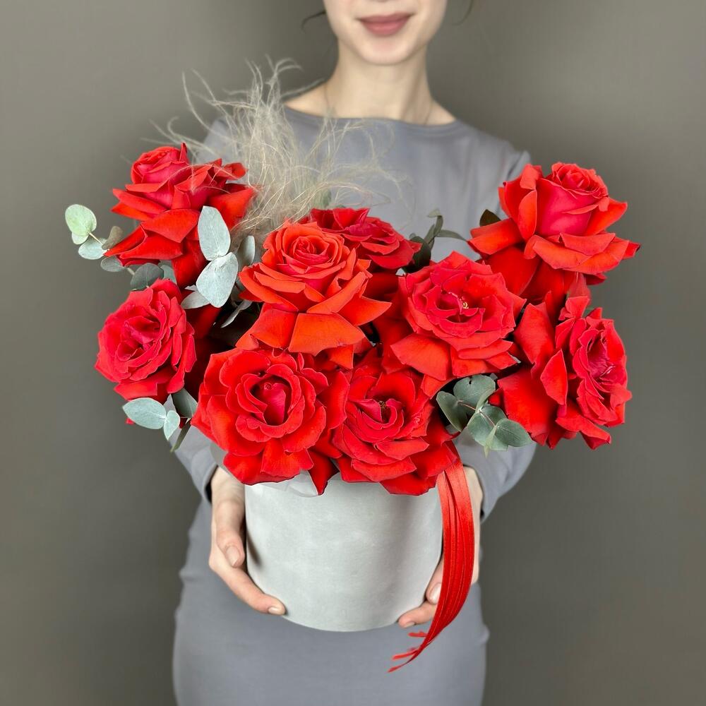 Шляпная коробка – 1 шт.Роза французская – 13 шт.Эвкалипт пучок – 1 шт.Оазис флористический – 1 шт.Дизайнерская упаковка – 1 шт.стифа пучок – 1 шт.