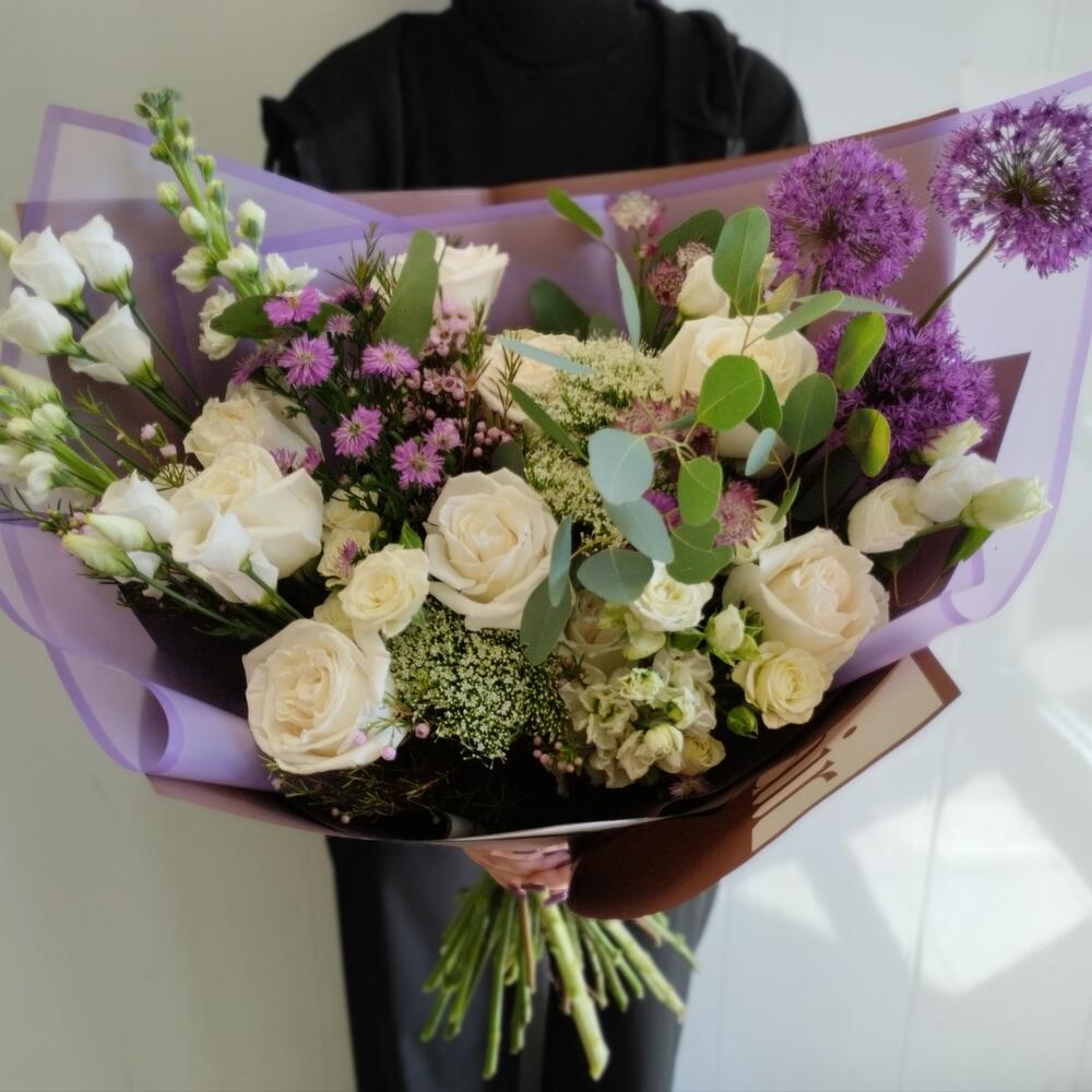 Роза – 9 шт.Роза кустовая – 4 шт.Лизиантус – 3 шт.Аллиум – 3 шт.Трахелиум – 3 шт.Астра кустовая – 3 шт.Астранция – 2 шт.Маттиола – 3 шт.васкфлауэр – 2 шт.Эвкалипт – 2 шт.Фисташка пучок – 1 шт.Упаковка дизайнерская – 5 шт.