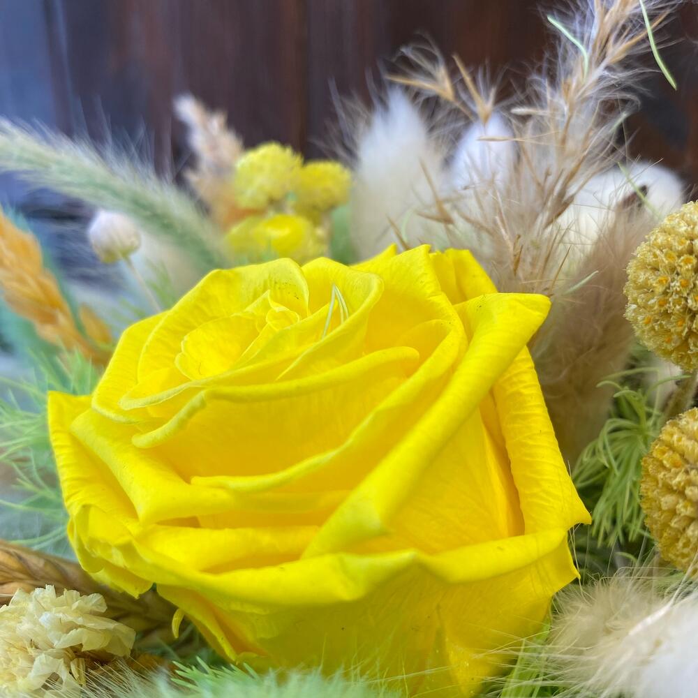 Сухоцветы – 10 шт.Роза стабилизированная – 1 шт.Лагурус (сухоцвет) – 20 шт.коаспедия стабилизированная – 3 шт.Кашпо керамическое – 1 шт.