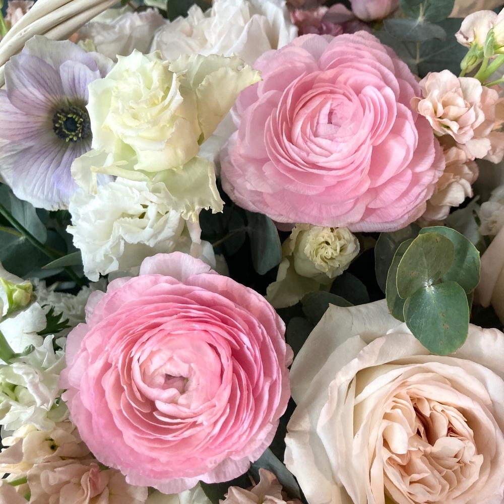 Анемон – 7 шт.Ранункулюс – 11 шт.Роза пионовидная – 15 шт.Лизиантус – 19 шт.Маттиола – 15 шт.Эвкалипт – 15 шт.Фисташка – 9 шт.Оазис флористический – 3 шт.Корзина – 1 шт.
