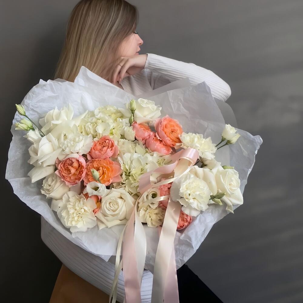 Гортензия – 2 шт.джульетта роза пионовидная – 3 шт.Лизиантус – 2 шт.гвоздики – 5 шт.playa blanca – 7 шт.Упаковка дизайнерская – 2 шт.Лента атласная – 3 шт.