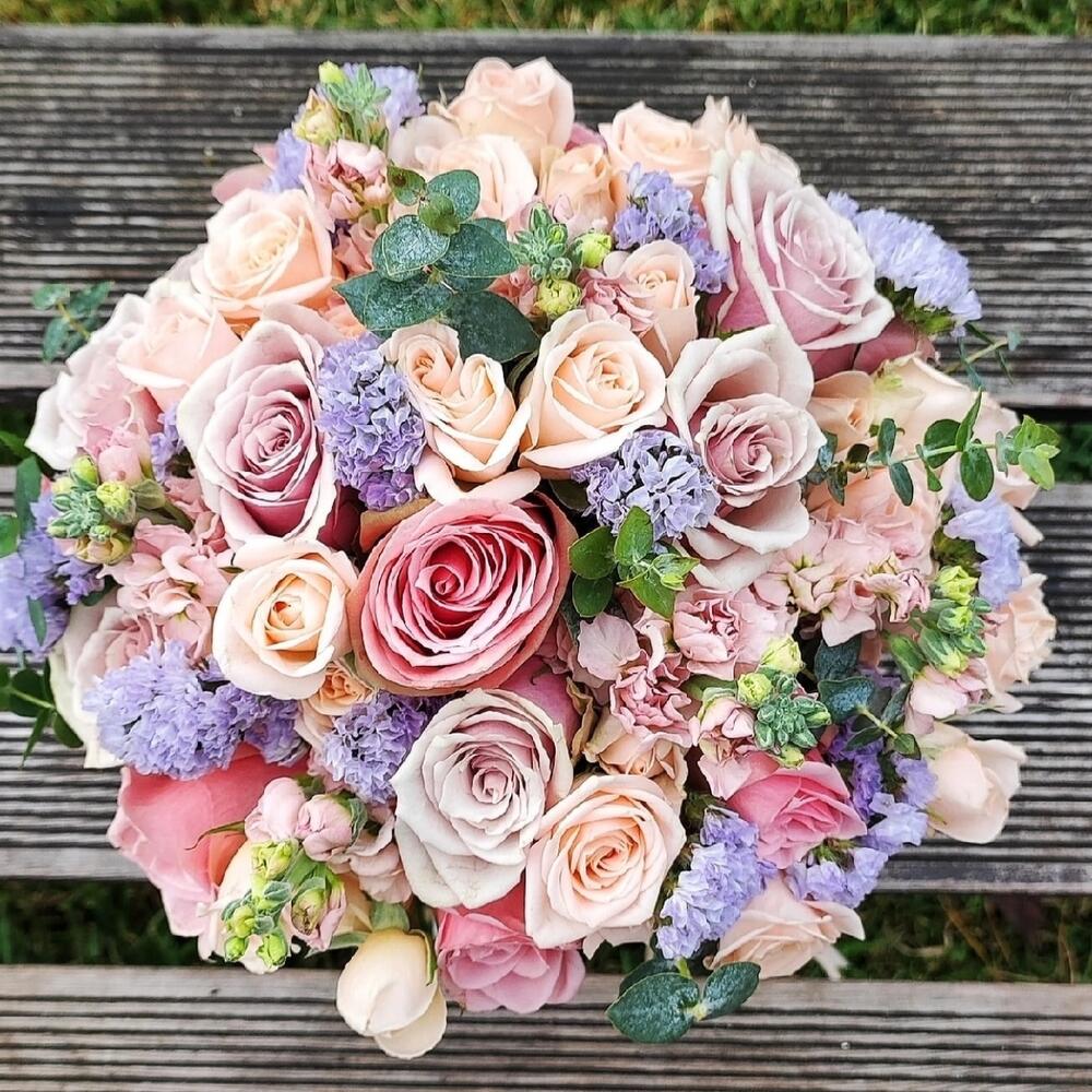 Маттиола – 9 шт.Роза кустовая – 7 шт.Статица – 5 шт.Эвкалипт – 1 шт.Роза Кенийская – 15 шт.