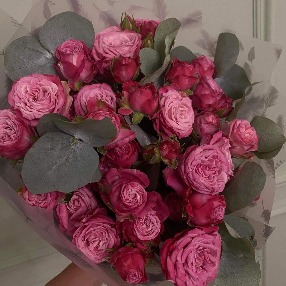 кустовые пионовидные розы – 11 шт. Эвкалипт – 5 шт. Упаковка дизайнерская – 1 шт. Открыточка с вашими пожеланиями – 1 шт.