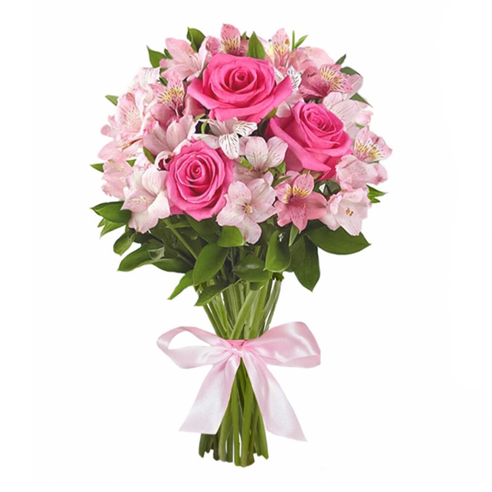 лента атласная (розовый) – 1 шт.альстромерия (белый) – 2 шт.альстромерия (розовый) – 3 шт.роза одноголовая розовый – 3 шт.