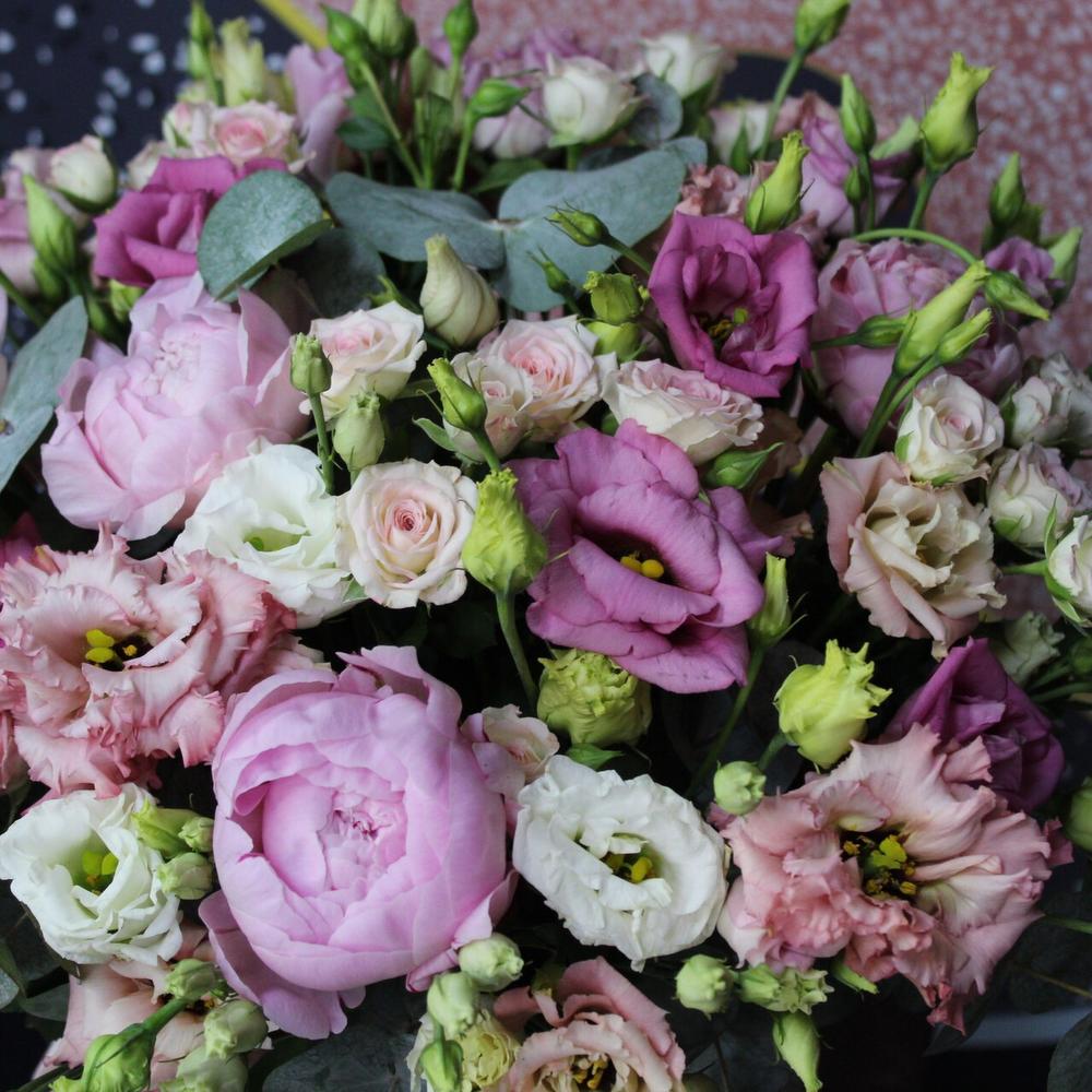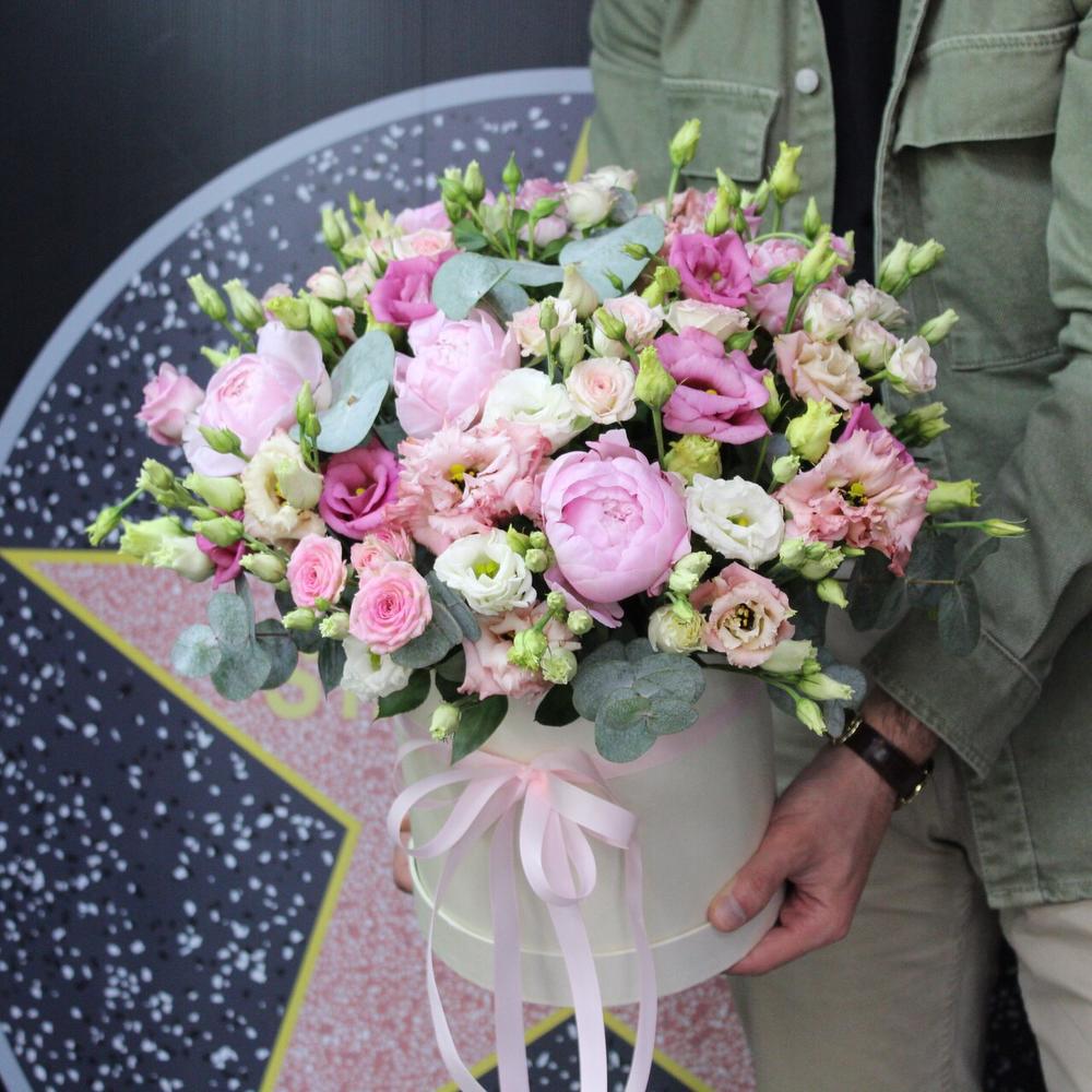Эустома – 11 шт.Роза кустовая – 5 шт.Эвкалипт – 4 шт.Коробка шляпная – 1 шт.Оазис флористический – 2 шт.Лента атласная – 2 шт.Пион Сара Бернар – 5 шт.