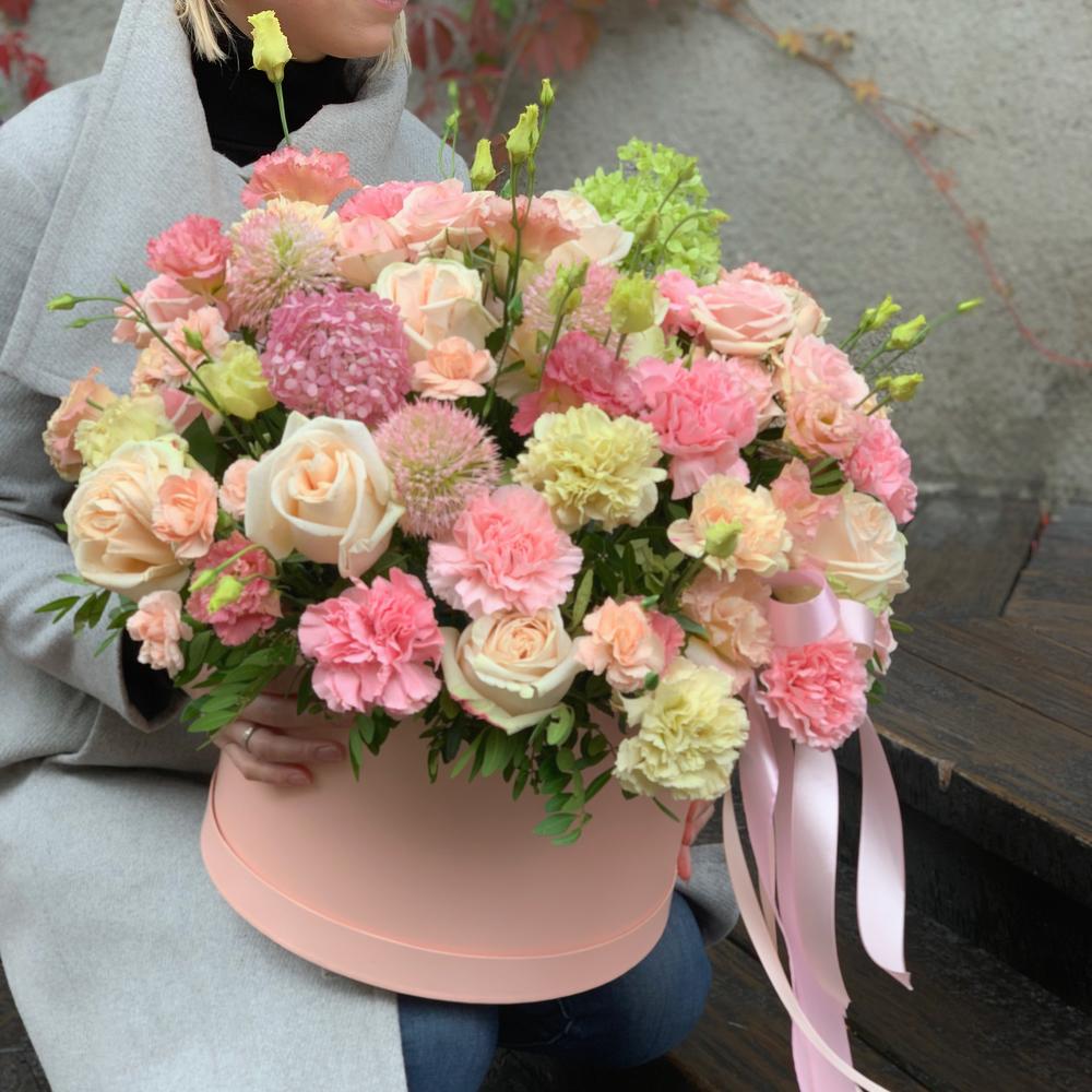 Роза кустовая – 5 шт.Лента атласная – 3 шт.Диантус – 23 шт.Коробка шляпная – 1 шт.Фисташка – 10 шт.Роза пионовидная – 11 шт.Диантус кустовой – 3 шт.Лизиантус розовый – 8 шт.Декоративные цветы – 5 шт.Оазис флористический – 3 шт.