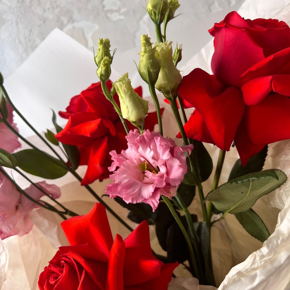 Яркий букет с французскими розами и махровым лизиантусом
