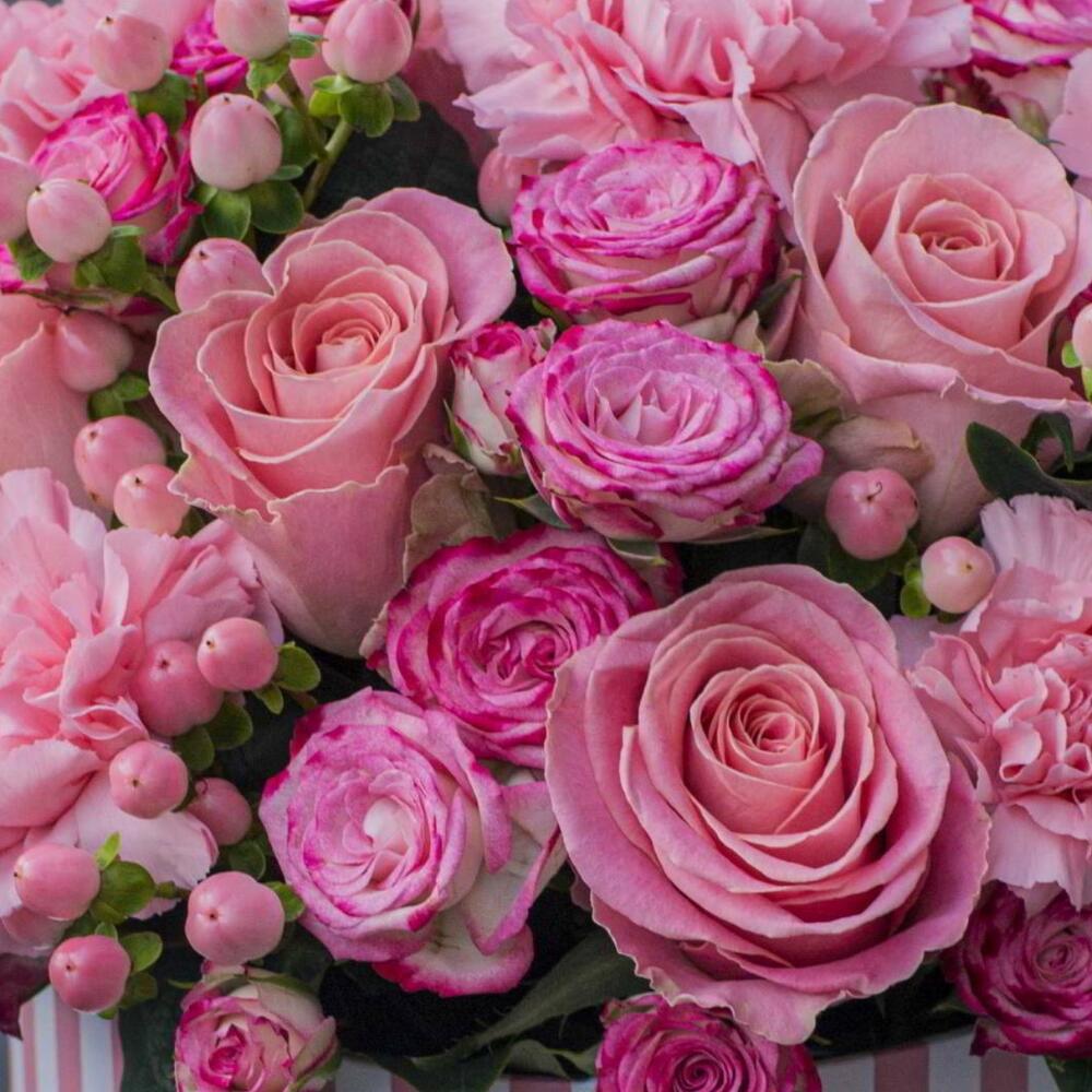 Роза кустовая – 5 шт.Гвоздика – 5 шт.Роза одноголовая – 7 шт.Хиперикум – 6 шт.Шляпная коробка – 1 шт.витаминная губка – 1 шт.
