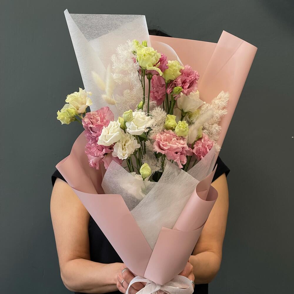 Букет из белых и розовых лизиантусов и сухоцветов "Нежное кружево"