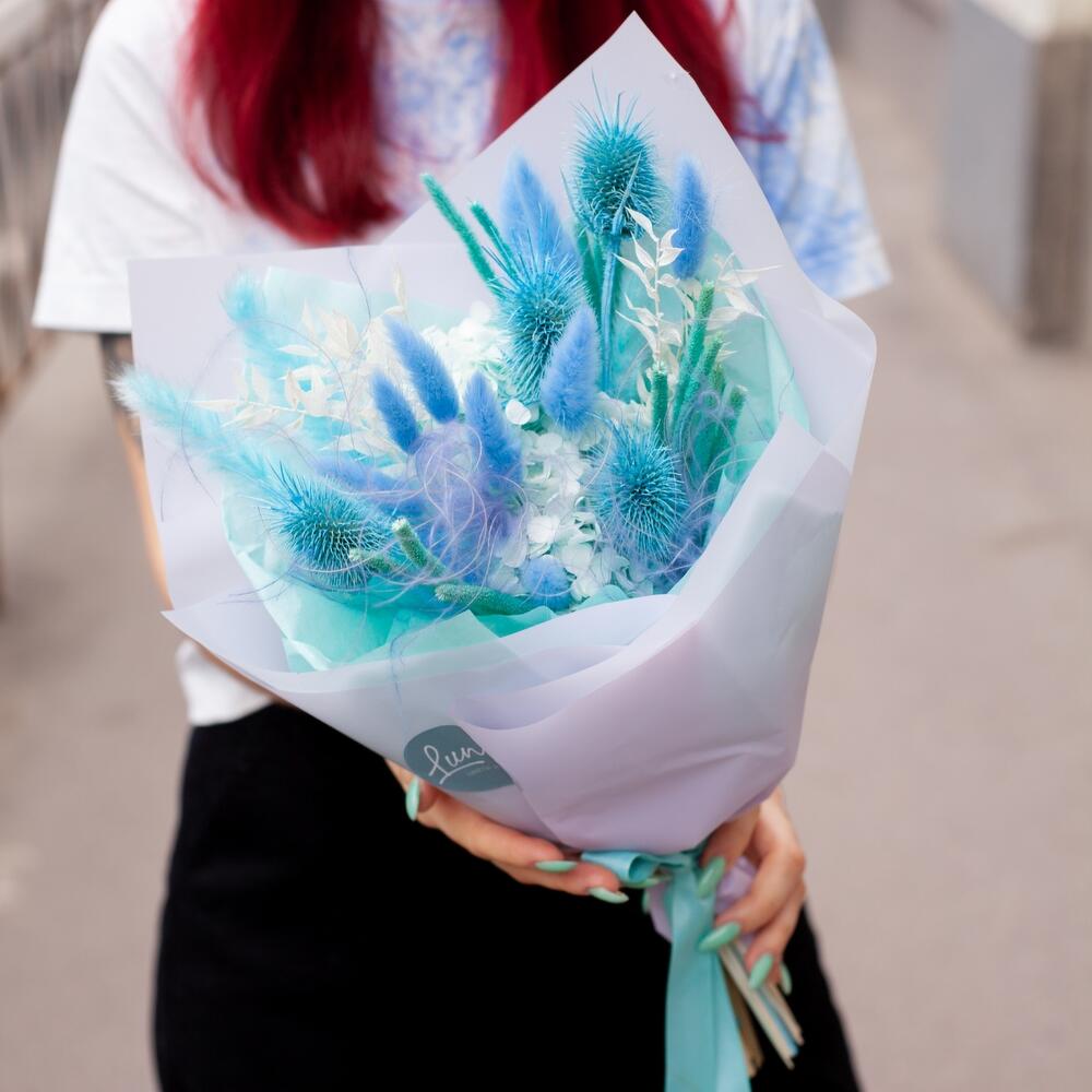 Дизайнерская упаковка – 1 шт.флеум – 3 шт.гортензия сухоцвет – 2 шт.эрингиум сухоцвет – 4 шт.лагурус сухоцвет – 6 шт.рускус сухоцвет – 3 шт.ковыль сухоцвет – 1 шт.пампасная трава (сухоцвет) – 3 шт.