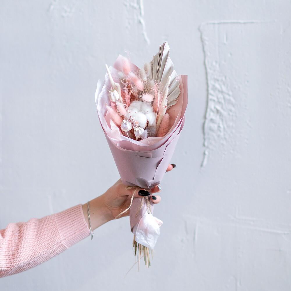 Хлопок – 1 шт.Лагурус – 2 шт.флеум – 1 шт.нигелла земляничная – 2 шт.Лист пальмы – 1 шт.гликсия – 1 шт.агростис – 1 шт.Дизайнерская упаковка – 1 шт.