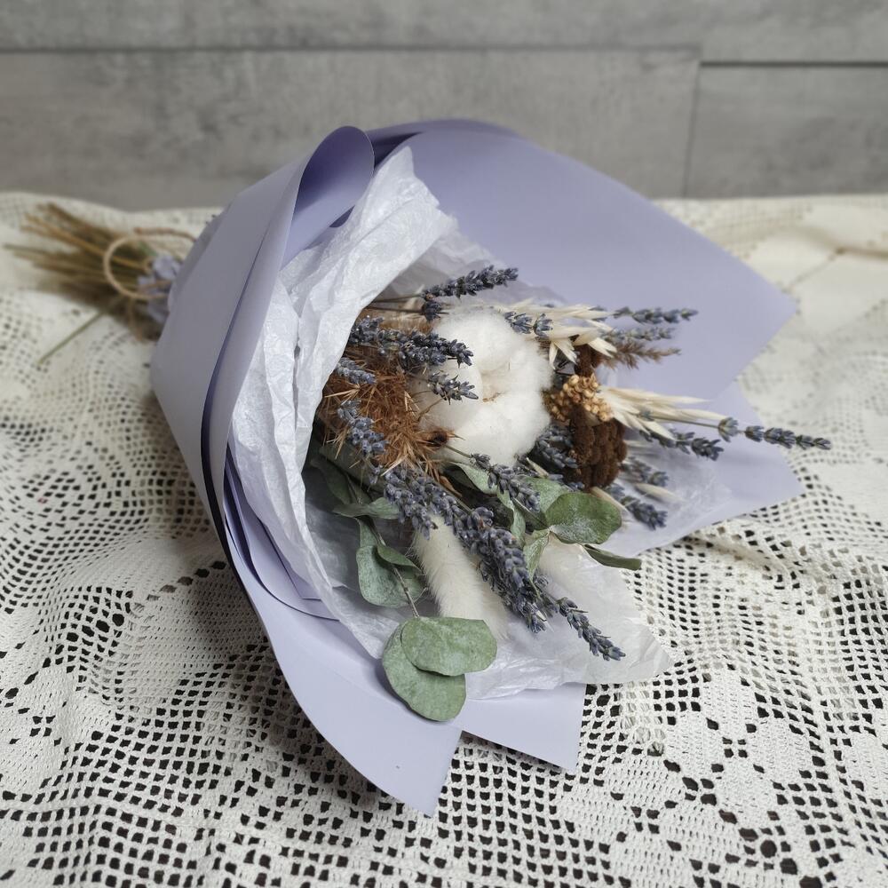«Лавандовое созвездие» Букет из розы, гвоздики, статица и хлопка