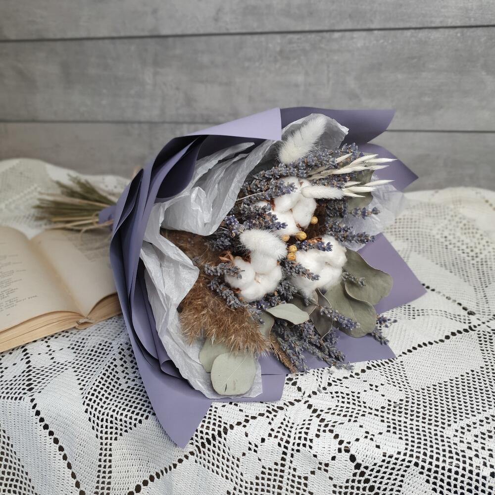 «Лавандовое созвездие» Букет из розы, гвоздики, статица и хлопка