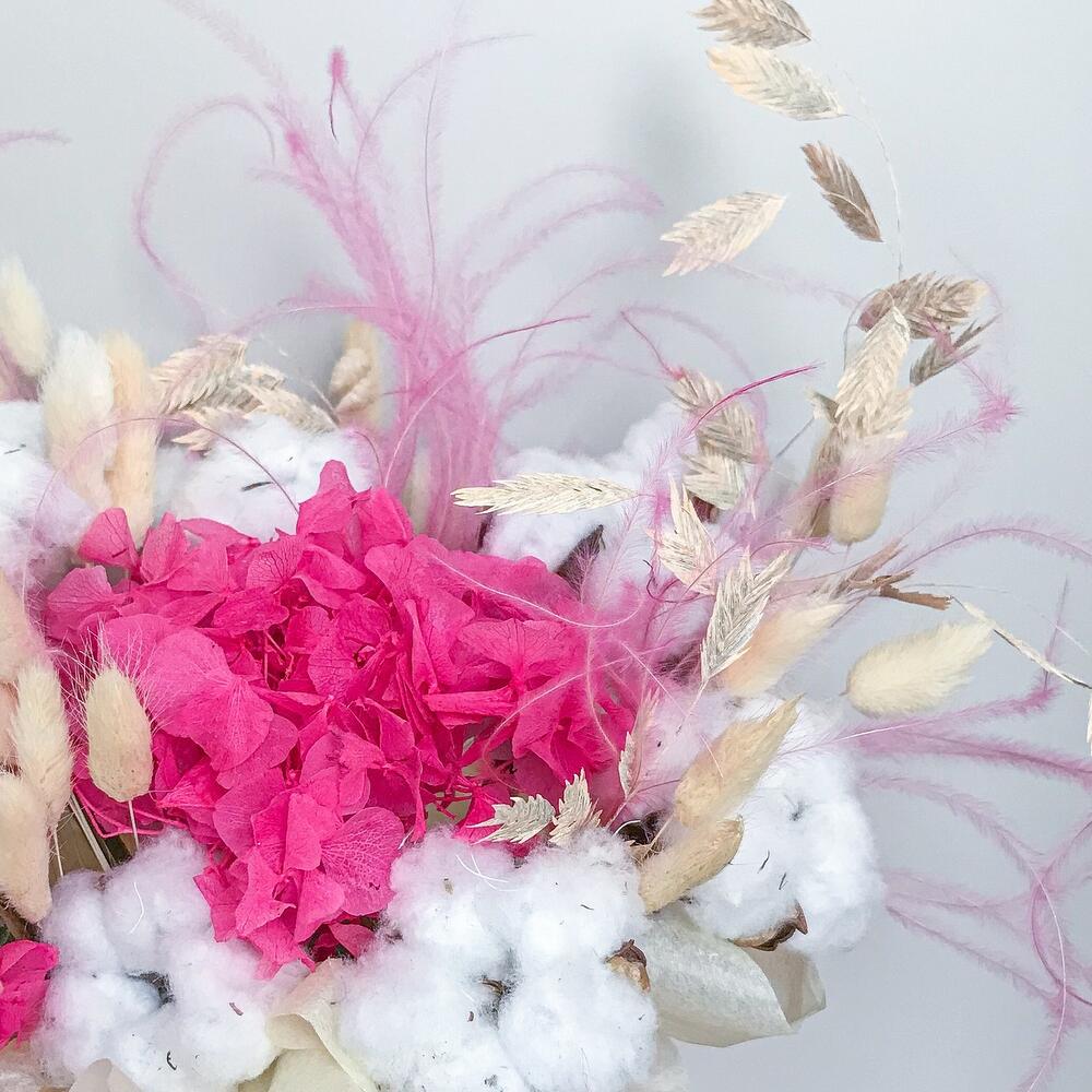 Гортензия – 1 шт.Хлопок натуральный – 7 шт.Лагурус (сухоцвет) – 25 шт.