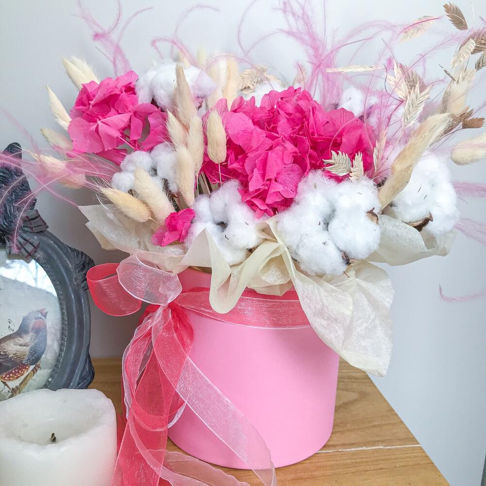 Интерьерная композиция из сухоцветов в шляпной коробке