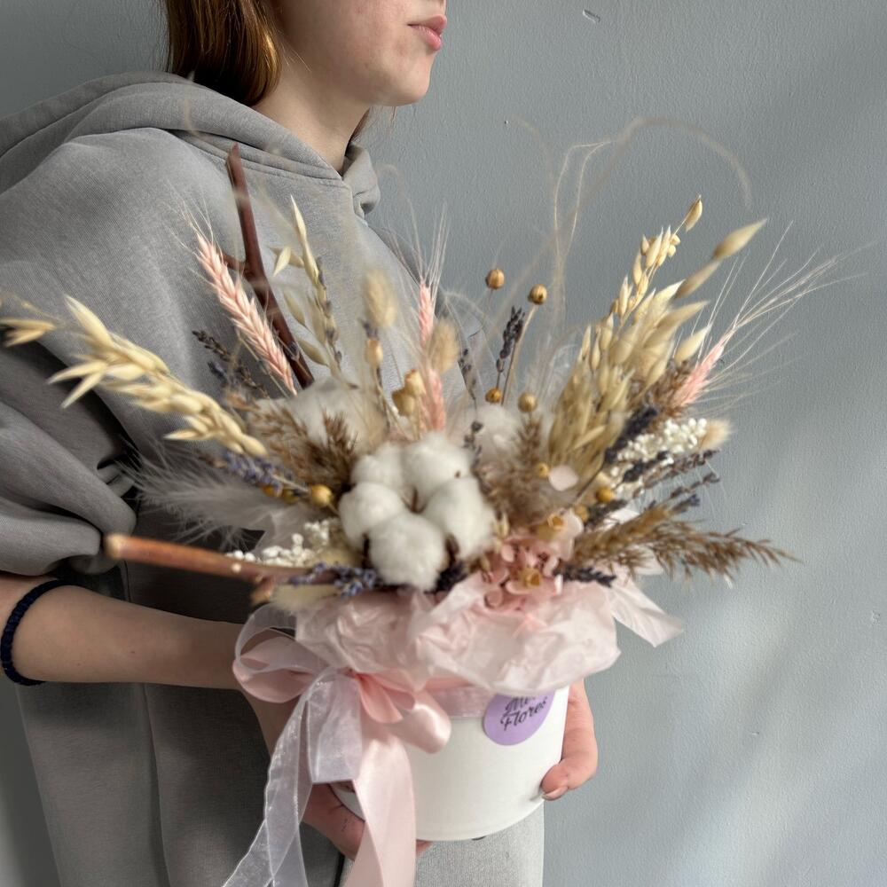 Хлопок натуральный – 3 шт.гортензия стабилизированная пучок – 2 шт.Лаванда (сухоцвет) – 25 шт.лен сухоцвет – 1 шт.овес сухоцвет – 6 шт.Лагурус – 8 шт.Пшеница – 4 шт.сорго – 3 шт.сухие цветы – 6 шт.Ковыль – 1 шт.Оазис флористический – 1 шт.Коробка шляпная – 1 шт.перья декоративные – 4 шт.