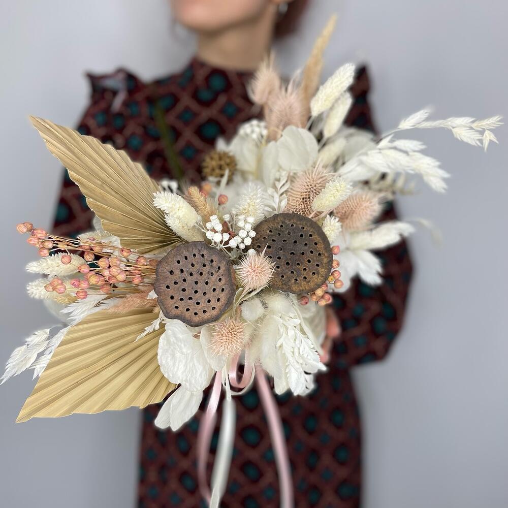 Кашпо металлическое – 1 шт.Оазис флористический – 1 шт.лист пальмы сухоцвет – 2 шт.лотос коробочка – 2 шт.эрингиум сухоцвет – 5 шт.Хлопок натуральный – 3 шт.фаларис сухоцвет – 23 шт.Лагурус – 31 шт.пижма сухоцвет – 3 шт.Эвкалипт стабилизированный – 4 шт.папоротник стабилизированный – 1 шт.лен сухоцвет – 6 шт.Колоски – 3 шт.рускус сухоцвет – 1 шт.вейник сухоцвет – 5 шт.Лента атласная – 2 шт.