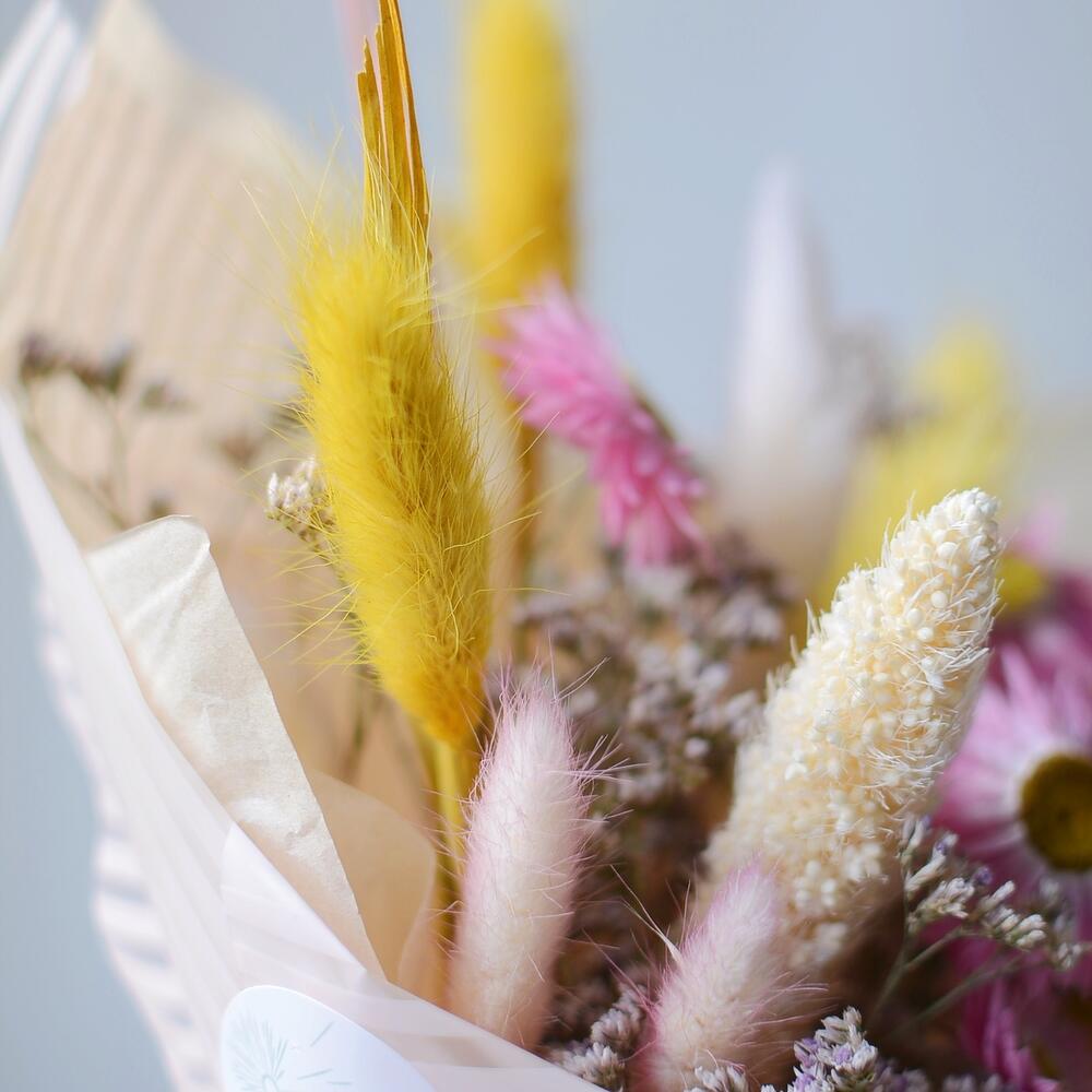 Упаковка дизайнерская – 1 шт.Сетария – 1 шт.лимониум пучок – 1 шт.акроклинум – 5 шт.лагурус микс пучок – 1 шт.