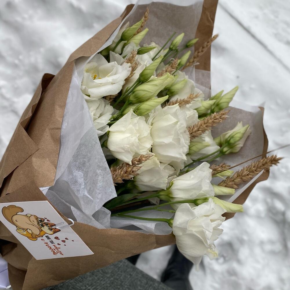 Лизиантус – 7 шт.Пшеница (сухоцвет) – 15 шт.Упаковка – 1 шт.Открытка мини – 1 шт.