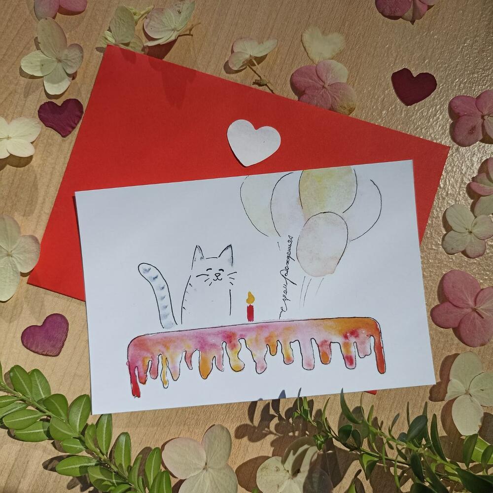 Открытка Кот с тортом “С днём рождения!” 10*15
