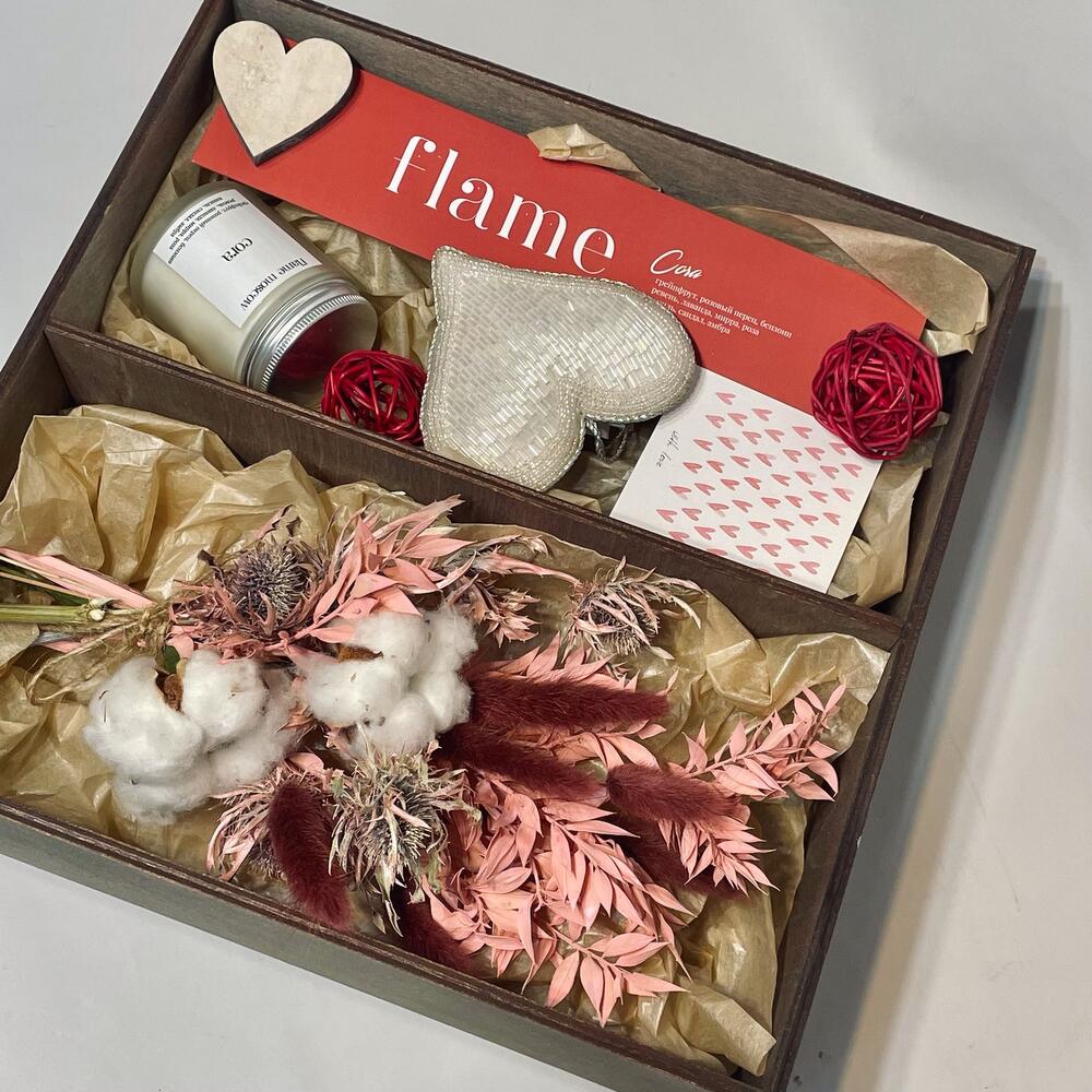 В набор входит:- аромасвеча Cora (грейпфрут, розовый перец, ревень, лаванда, ваниль)- благовония Cora- букет из сухоцветов- шар ротанговый 2шт- сердце деревянное 2шт- сердце мягкое с бисером- открыточка (текст можете написать в комментариях)- деревянный ящик