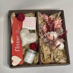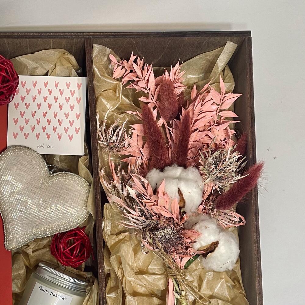свеча (кокосовый воск) – 1 шт.благовония – 1 шт.сердце декоративное – 1 шт.Сердце деревянное – 2 шт.Шар ротанг – 2 шт.Открытка – 1 шт.рускус стабилизированный – 1 шт.Хлопок – 2 шт.эрингиум сухоцвет – 1 шт.Лагурус (сухоцвет) – 7 шт.Тишью – 1 шт.Ящик деревянный – 1 шт.