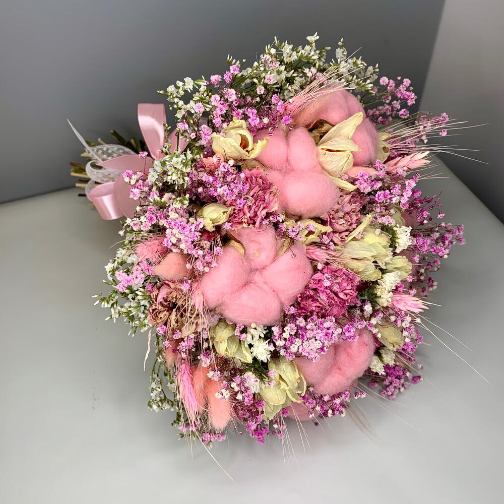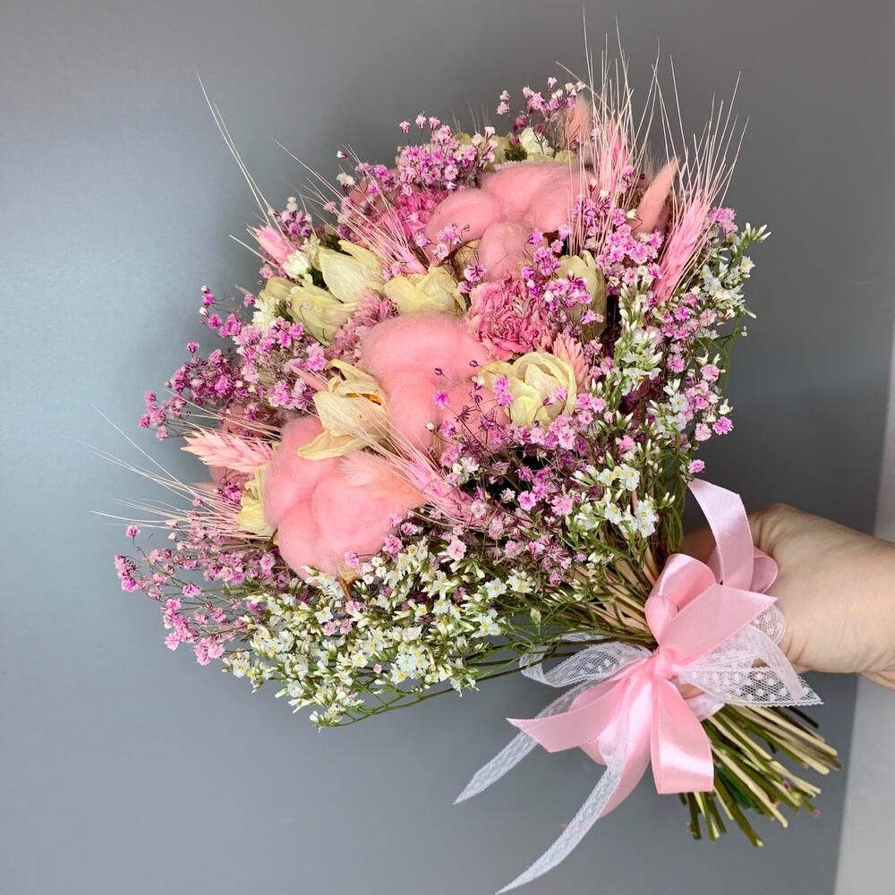 Хлопок – 7 шт.Лента атласная – 2 шт.Кружево – 2 шт.Сухоцветы – 30 шт.Лагурус (сухоцвет) – 12 шт.Тритикум(пшеница) – 14 шт.лимониум сухоцвет – 11 шт.гипсофила сухоцвет – 15 шт.