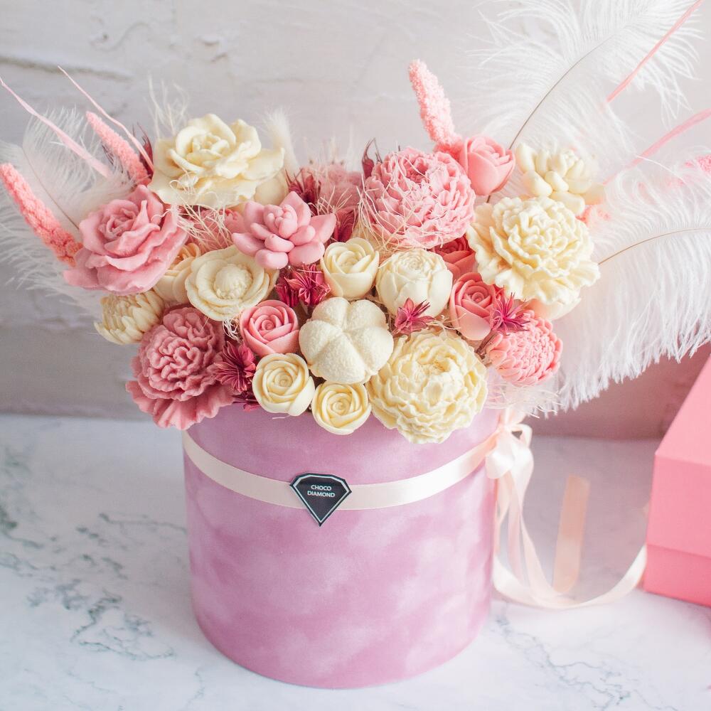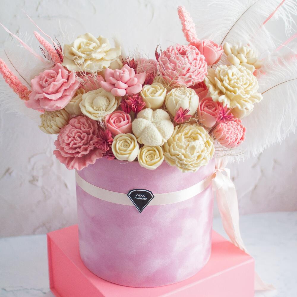 Состав: белый, клубничный бельгийский шоколад Callebaut, украшен сухоцветами и перьями Размер букета: диаметр: 30 см; высота: 35 см Общий вес: 1725 гр (возможно расхождение +/- 10 гр) Упаковка: букет упаковывается в прозрачную плёнку и завязывается бантиком Срок годности:1 … Показать ещёмесяц. Хранить в сухом прохладном месте, вдали от солнечных лучей